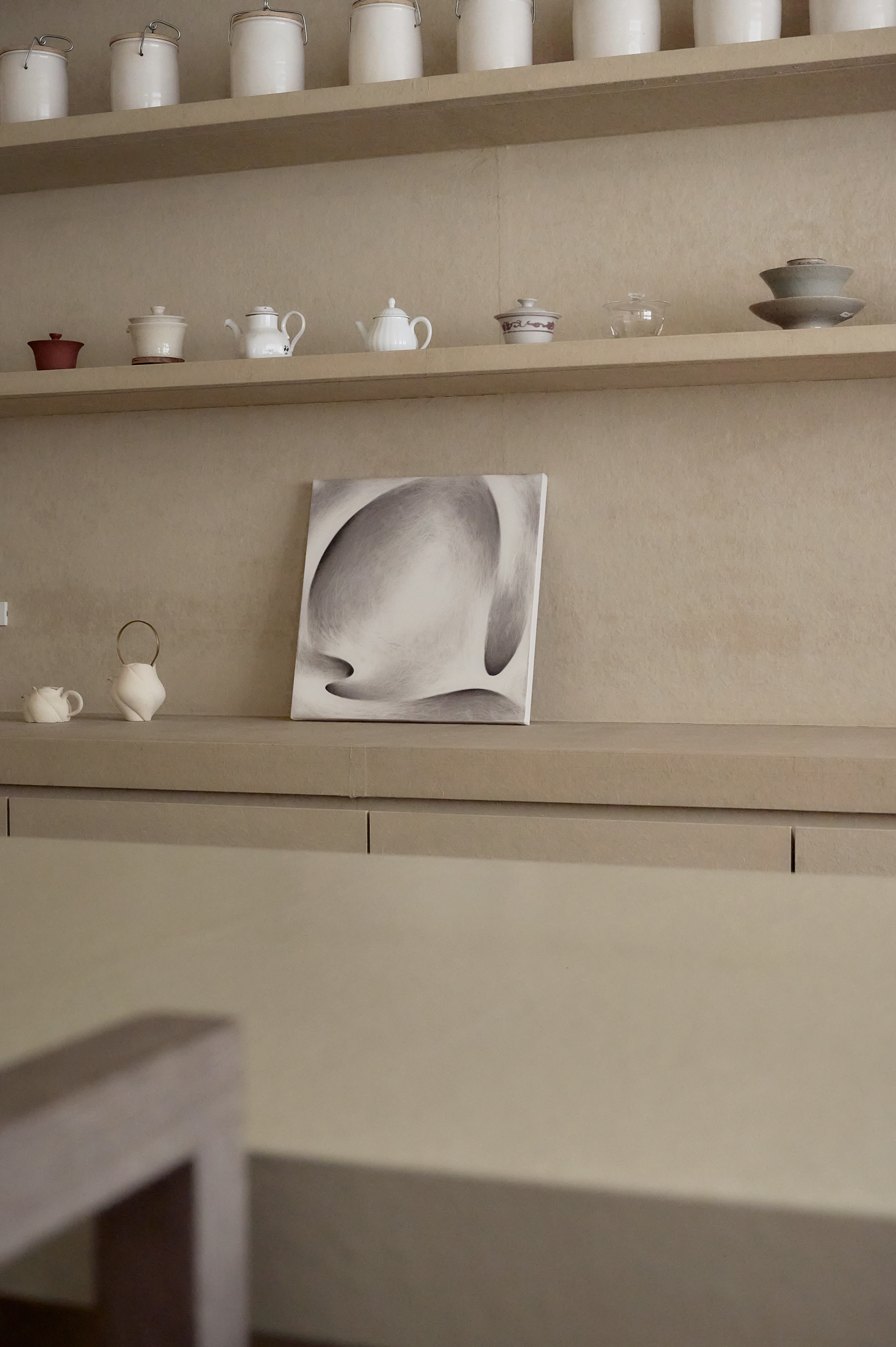 お茶を飲む行為には、茶の風味を味わうだけでなく、体内や精神といった内的世界を感じる体験でもあるようで。 そうしたお茶の精神性と、私の描く世界観とが通ずるものがあり、展示させていただく運びとなりました。 本展では、2年半ぶりの新作を含むドローイング作品を発表。個展に合わせた茶会も開かれました。