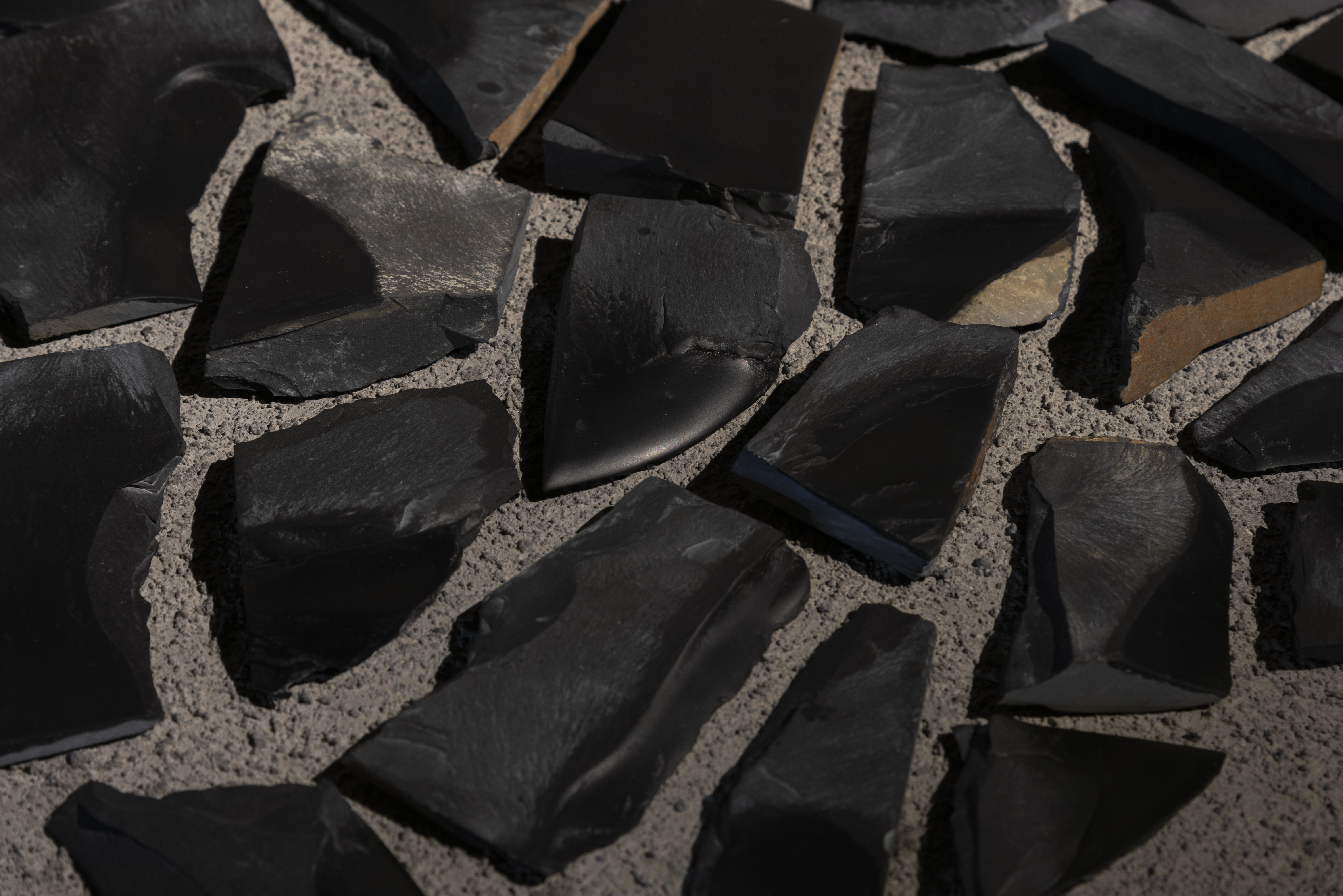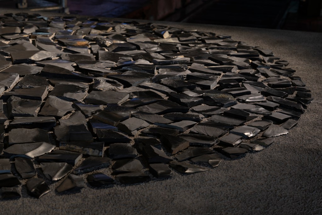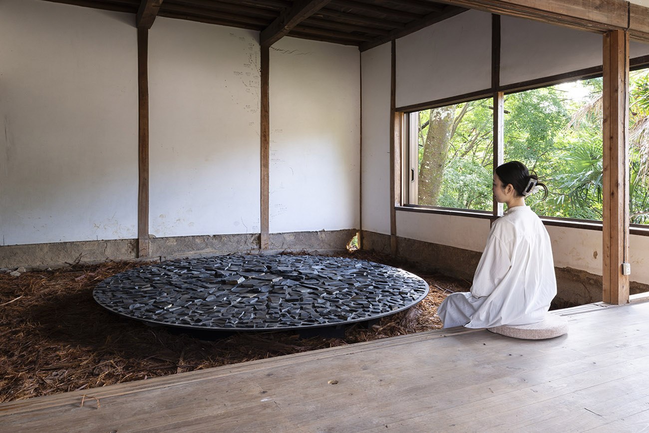 熊野古道で知られる聖地 那智で産出される「那智黒石」。その自然石をひとつずつ手で磨いた欠片を集めた作品。本作の制作は、70名もの方がワークショップとして石磨きに参加していただき、ひとつの景色をつくっています。一欠片を磨くのに、およそ1時間は要し、その時間は静かに自身を内観する時間でもある。磨いた人の心身の状態が石に反映されるため、真の姿を写す鏡のようだと思い《真鏡》と名し、ひとつの鏡に見立てている。