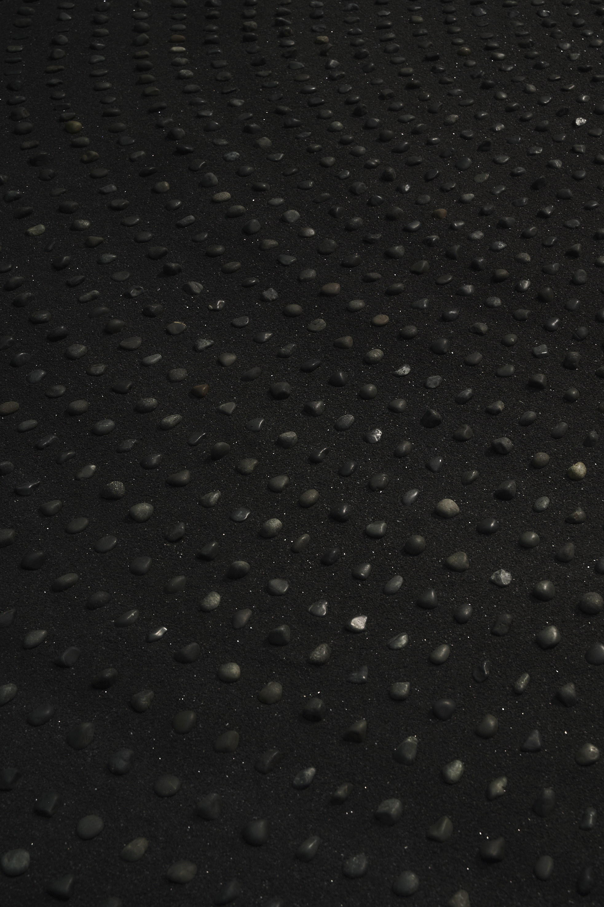 お墓の聖地にあった玉砂利を、何度も洗い、汚れを拭い、並べる。ひとつとして同じものがない石が最も輝く場所に立ち、ひとつの大きな景色となる。その景色は、あらゆる生命体がそれぞれの役割を担い共存する世界の縮図にもみえる。
