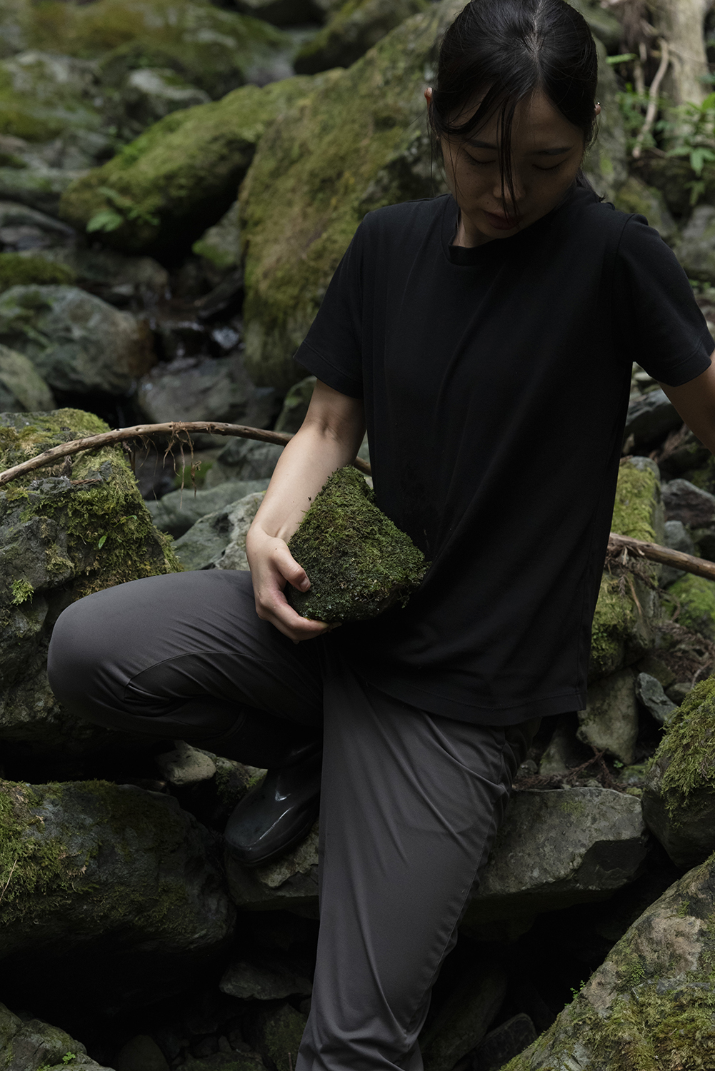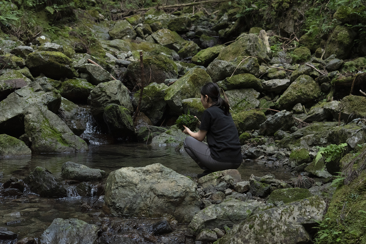 「修験道」発祥の地、吉野。吉野の山奥で出逢った石は、その姿が見えなくなるほどに苔生していた。清らかな水や光、豊かな生態系が育まれた場所に長年佇んでいたから、これだけ苔や葉が石に根付いたのだろう。そんな植物や微生物のために自らの身を委ね、他と共生している石の姿は美しかった。