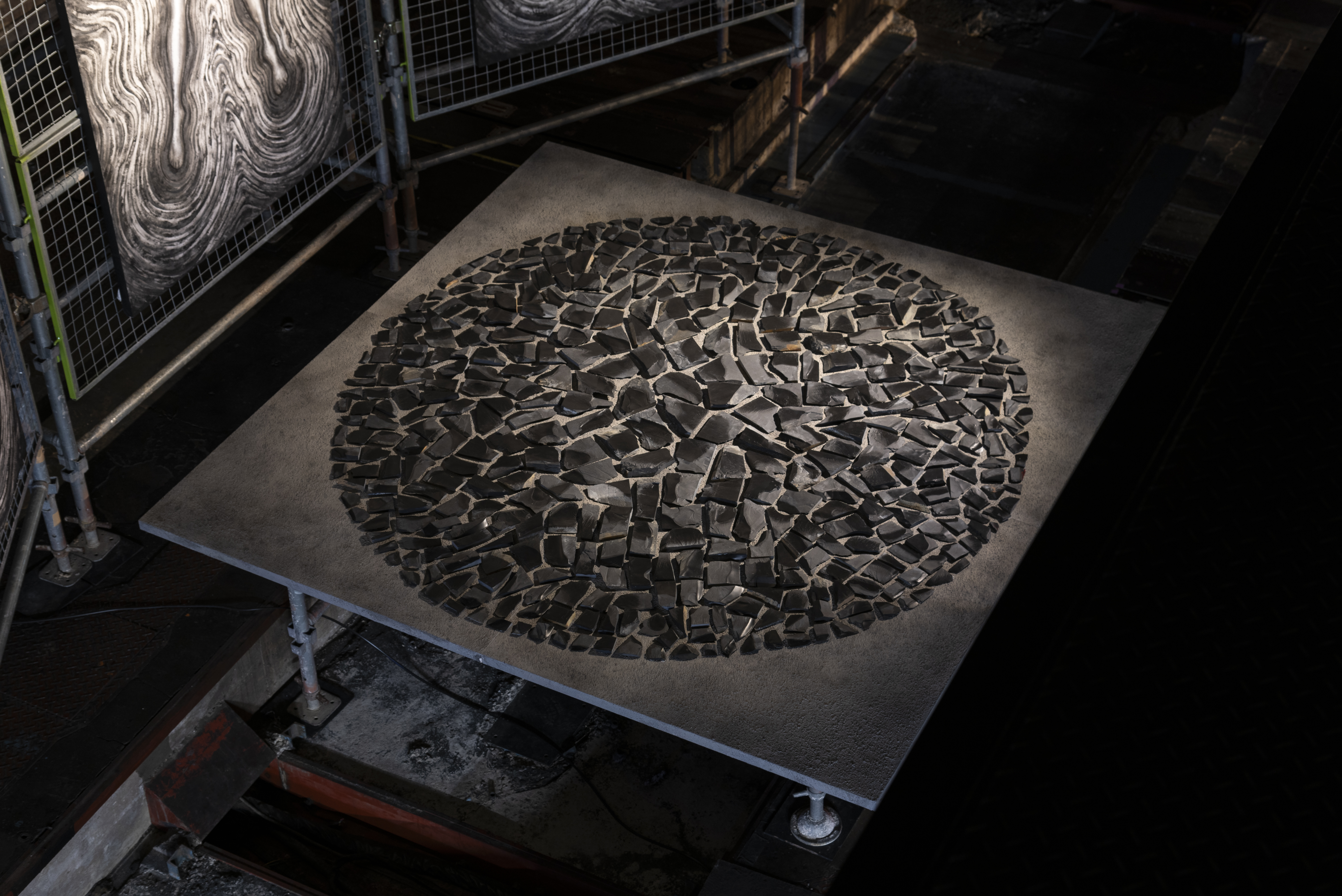 それぞれの石は、144名と磨いたものであり、それらの欠片が集結し、大きな鏡のような、ひとつの景色となっている。作品の周りをゆっくり歩いたり、腰をかけて眺めながら、ささやかな光や音の変化を、そして自身の心の模様を感じてみてほしい。